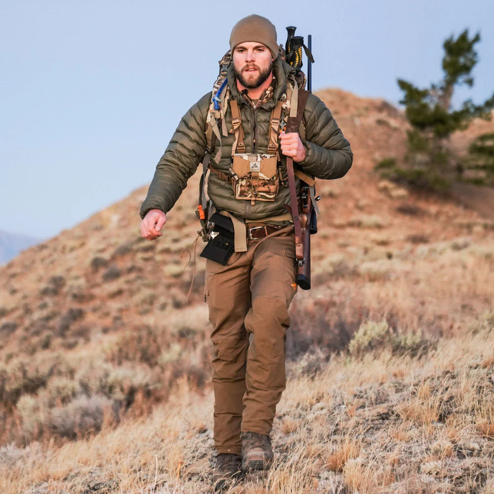 As you prepare for early season sits in a tree stand, hunting the Elk Rut in September, or getting out for Mule Deer in the waning warmth of October, you can rest assured First Lite has your pants covered. The new Obsidian Foundry pant continues to incorporate field-tested and approved ripstop merino into the outerwear's main body to better regulate temperature, remain silent when moving, and resist the build-up of odor-creating bacteria. Key friction zones through the Seat, Crotch Gusset, and Lower Leg have been constructed with durable stretch nylon to provide snag and tear resistance where it is needed most and offer moisture protection through DWR treatment. To top them off, the Obsidian Foundry pants feature and include a new suspender system with reduced hardware and friction points for hunters who pack out heavy.