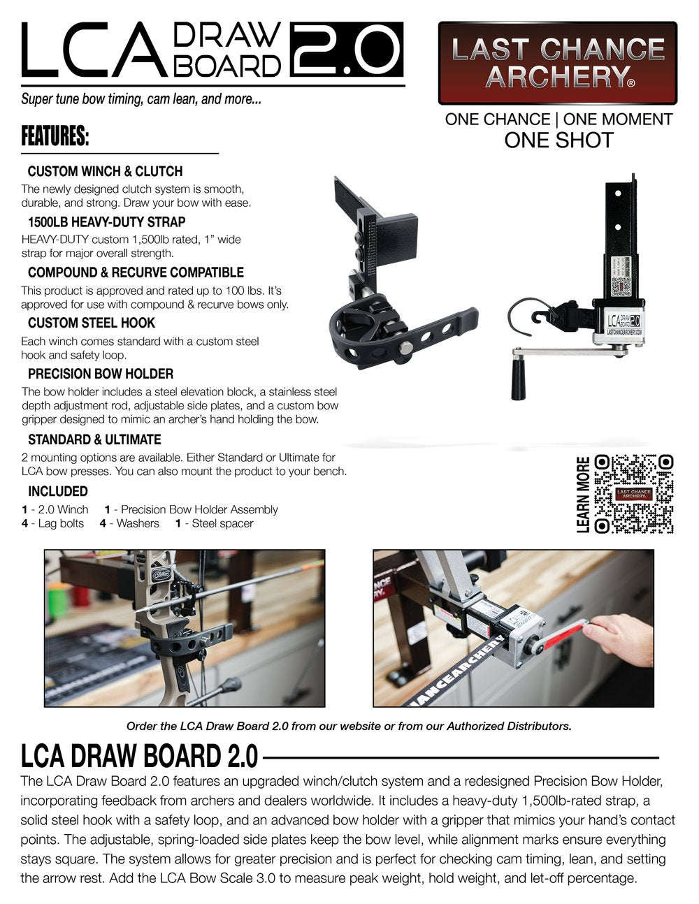 The LCA Draw Board 2.0 features an upgraded winch/clutch system and a redesigned Precision Bow Holder, incorporating feedback from archers and dealers worldwide. It includes a heavy-duty 1,500 lb-rated strap (500lb working load & 1,500lb breaking point), a solid steel hook with a safety loop, and a Precision Bow Holder with a gripper that mimics your hand’s contact points. The adjustable, spring-loaded side plates keep the bow level, while alignment marks ensure everything stays square. The system allows for greater precision and is perfect for checking cam timing, lean, and setting the arrow rest. Add the LCA Bow Scale 3.0 to measure peak weight, hold weight, and let-off percentage.